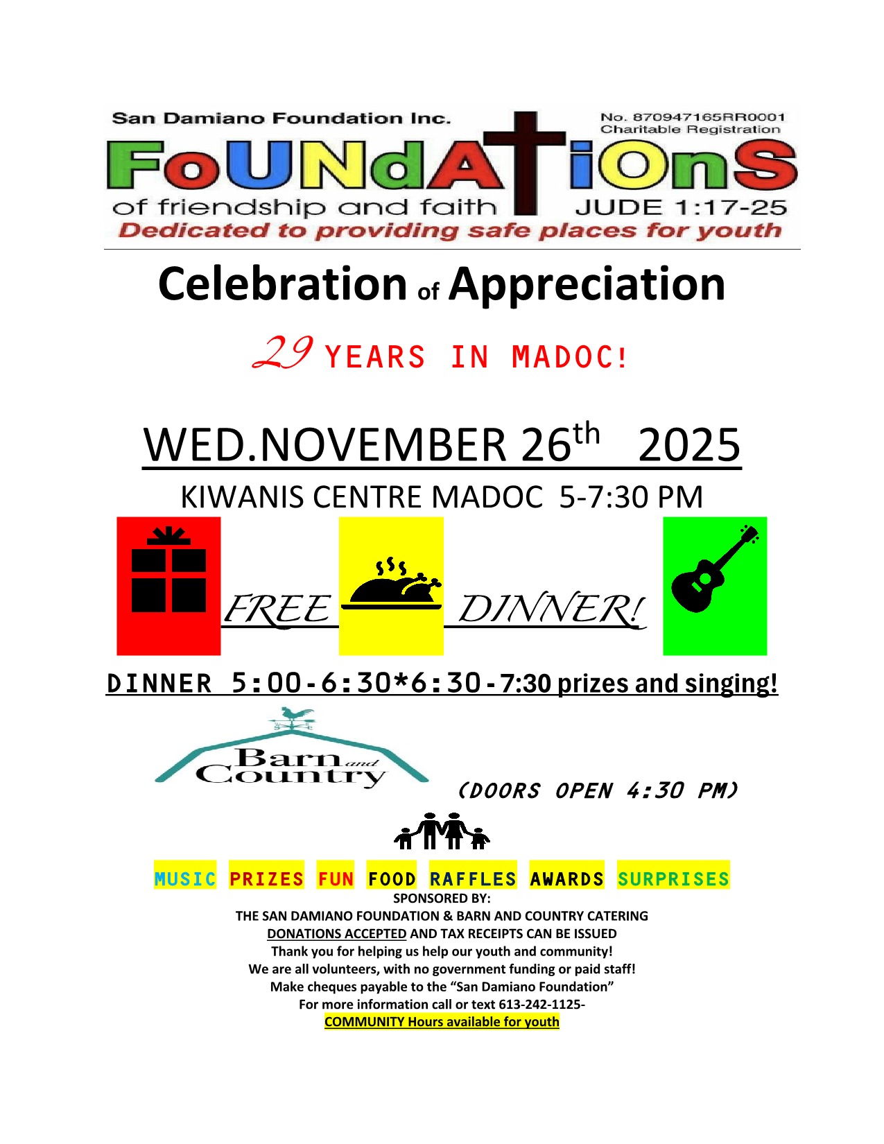 The San Damiano Foundation has always worked very closely with local Food Banks, Businesses, Schools, Law Enforcement Officers, Churches, Ontario Works & Social Service Agencies, Community Issues Committees, Municipal Councils & local Chambers of Commerce & many others. In efforts to assist local community relationships & develop social skills, Youth are encouraged & recognized as a resource to Church & Community.